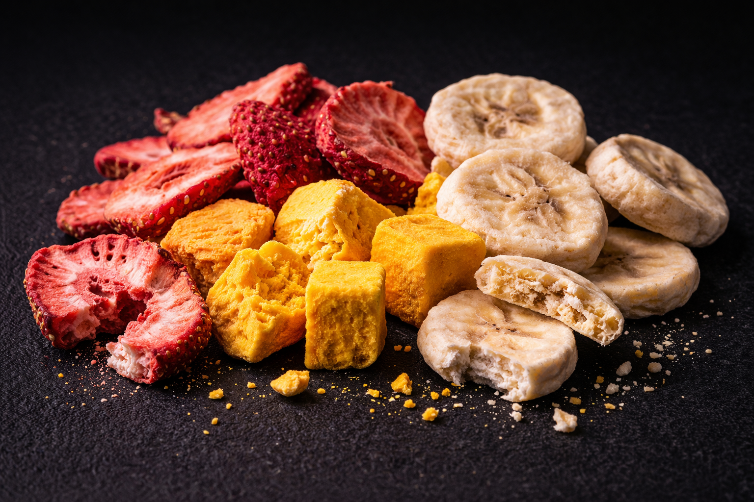 Mediante sublimación a −45 °C eliminamos el agua sin alterar la estructura del alimento, concentrando sabor y creando una textura ligera, seca y sorprendente.